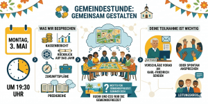 Am Montag, den 3. Mai um 19:30 Uhr treffen wir uns zur Gemeindestunde. Alle Gemeindemitglieder sind herzlich eingeladen, an der Gemeindestunde teilzunehmen. Wie jedes Mal erhalten wir einen kurzen Kassenbericht, …